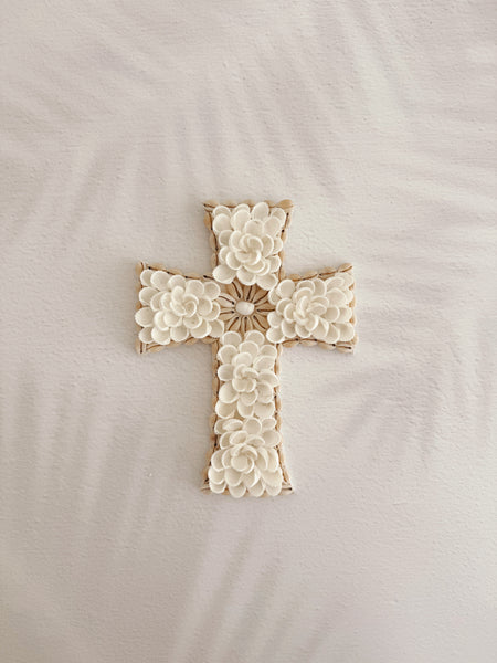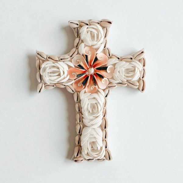 Enhance your home with the exquisite beauty of our Rosette Shell Cross. This stunning wall decor features a delicate cross made of real shells, adorned with intricate flower like designs. A perfect addition to your decor, adding a touch of elegance and culture to your space.