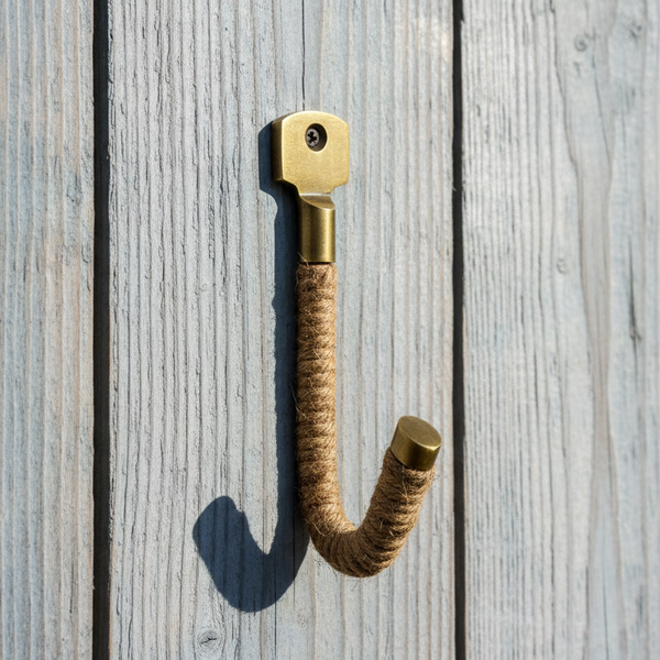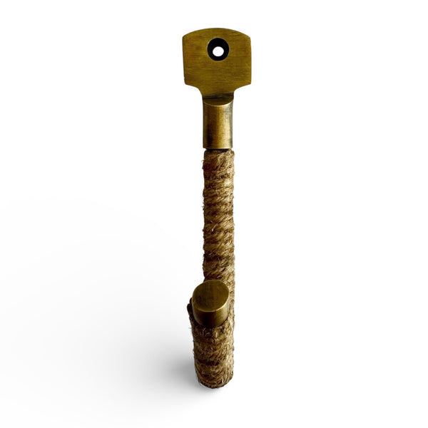 An elegant hand-crafted brass hook that seamlessly marries industrial charm with natural textures. The Antique brass finish is complemented by meticulously woven jute rope detailing, creating a refined accent piece for discerning interiors. Perfect for organizing entryways, studies, or bedrooms with understated sophistication. Each piece reflects the artisan's attention to detail, offering both practical functionality and timeless aesthetic appeal. Matching pull also available.